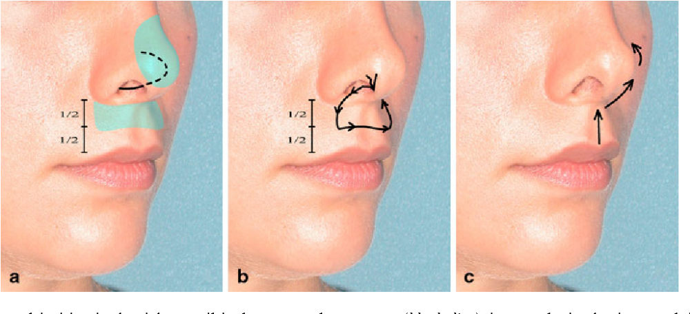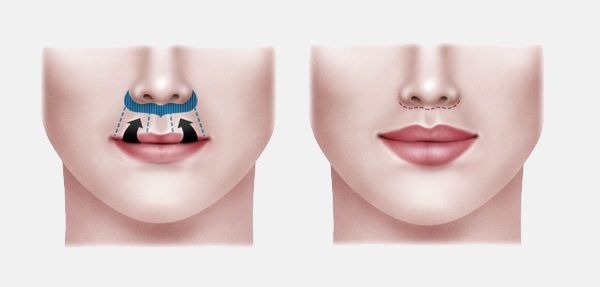 Bác sĩ phẫu thuật sẽ rạch một đường thường được giấu dọc theo đáy mũi, nơi ít nhìn thấy hơn. Đường rạch thường được tạo hình đầu bò và trung tâm, bên phải và bên trái của môi đều được kéo lên về phía mũi.