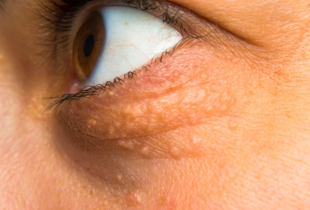 Cholesterol tích tụ quanh mắt thường là triệu chứng của bệnh tăng lipid máu hoặc bệnh tim. Chúng có màu hơi vàng và xảy ra khi chất béo dư thừa trong cơ thể bắt đầu tích tụ dưới da. Chúng thường được nhìn thấy nhiều hơn ở những người trung niên, mặc dù chúng có thể xảy ra ở mọi lứa tuổi. Mặc dù những sự phát triển này hầu hết là vô hại, chúng có thể khá nổi bật, làm mất thẩm mỹ và khiến người mắc phải cảm thấy tự ti.